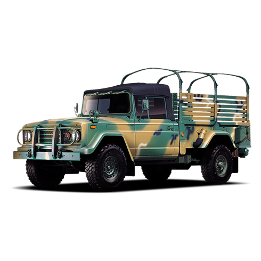 This 1-1/4-ton cargo truck was developed in Korea for the transportation of cargo and soldiers. It has been renovated with new functions that include a high horsepower engine and power train, and a new ergonomics design that allows for the convenience and safety of the operation of devices and instruments.