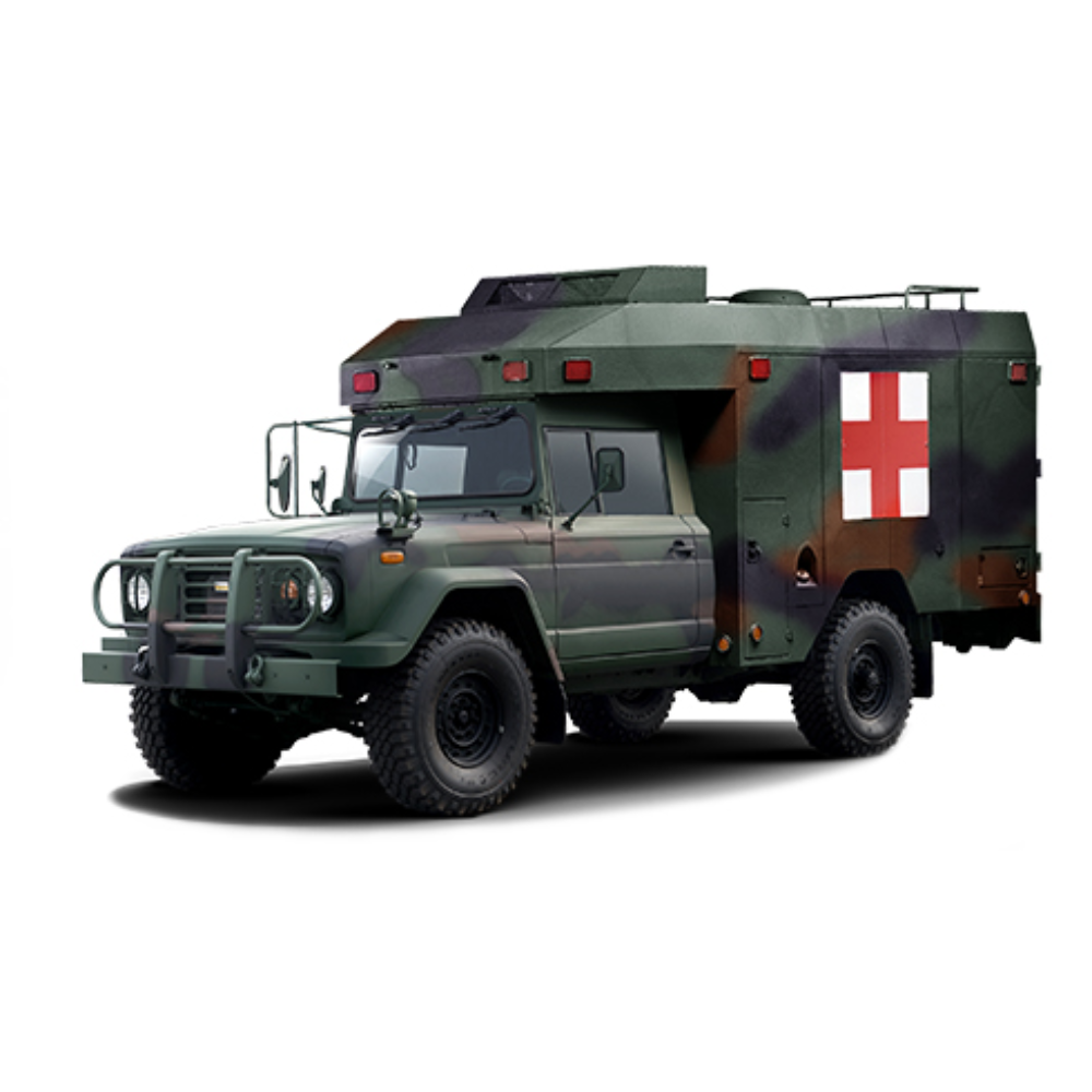 The ambulance truck is mounted with an integrated shelter that is equipped with emergency rescue medical devices on the 1-1/4 ton standard chassis for improving the operation convenience of medical staff and patients. It was developed for the purpose of eliminating troubles that had resulted from aging and the deficient power of the conventional ambulance truck.